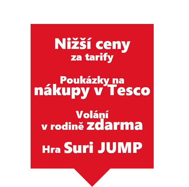 Získejte víc než tarif! V naší aplikaci na vás čekají: Nižší ceny za tarify Poukázky na nákupy v Tesco Volání v rodině zdarma Hra Suri JUMP